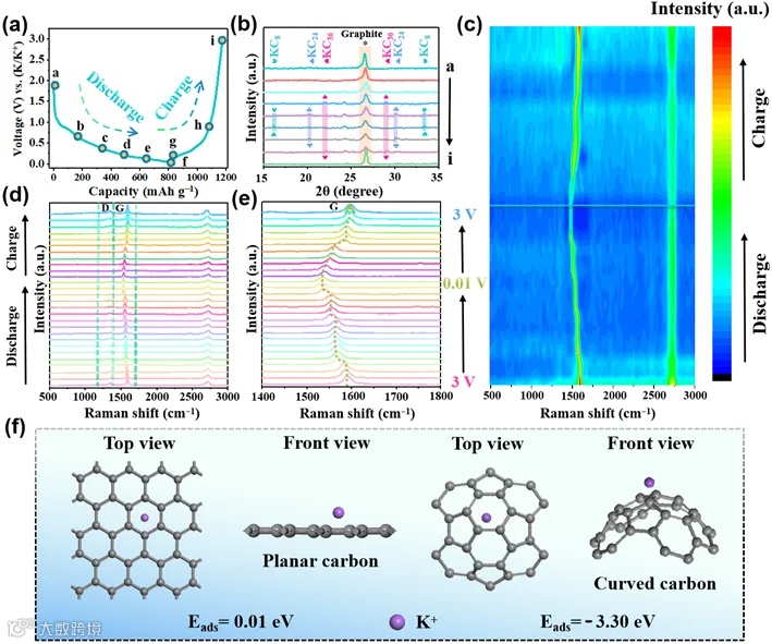 为阐明FEG-CNC-180作为钾离子电池负极材料的钾储存机理,研究采用离子XRD对其初次放电-充电循环过程进行了表征。结果显示,在整个过程中均可观察到各种钾间质化合物(KCx)的形成,与前期研究结果一致。在放电过程中,002石墨烯峰强度逐渐减弱,同时出现新的KC36(22.03°/29.51°)、KC24(20.35°/30.72°)和KC8(16.48°/33.46°)峰。在后续充电中,KCx相对应的峰强度逐渐减弱消失。这证实了钾化和脱钾过程中KC36、KC24和KC8相的可逆和分步转变。 此外,原位拉曼光谱结果显示随电池放电至0.01V,D、G峰强度下降,与钾离子进入碳层形成间质化合物相吻合。同时观察到G峰红移,可能由于钾插入后电子密度和立体障碍增加导致的C-C键张力变化。充电至3V后,G峰强度恢复原状,证明FEG-CNC-180负极的高可逆性。分子动力学模拟结果表明,弯曲石墨烯表面对钾离子的吸附能较平面石墨烯低,说明CNCs结构更有利于钾离子的吸附和储存。