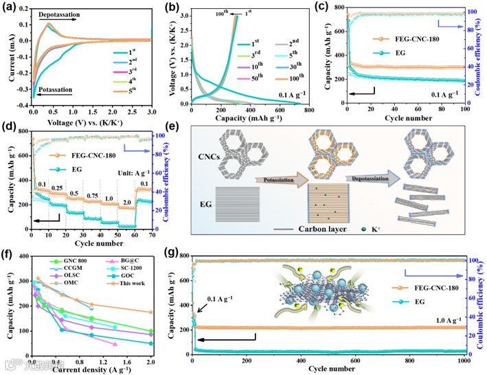 研究系统评价了通过闪光焦耳加热法一步合成的FEG-CNC-180作为钾离子电池负极材料的物理化学属性及电化学性能。循环伏安结果显示,FEG-CNC-180在首次阴极扫描中出现明显峰值,表明钾离子插入石墨层;后续循环曲线重合良好,反应可逆性好。伽凡动态放电曲线表明其机理与EG相似。初次放电出现的平台对应SEI层形成;0.1V和0.25V平台对应钾离子插入形成KCx相。FEG-CNC-180在0.1A/g下初次可逆容量高达312.3mAh/g,循环100次后容量保持率达95.6%;不同电流密度下均优于EG。其三维连通笼状结构有利于电子和离子传输,结构稳定性好。此外,FEG-CNC-180在1000次循环后容量保持219.6mAh/g,CE近100%,长期稳定性优异。总之,FEG-CNC-180作为钾离子电池负极材料,具有出色的电化学性能、结构稳定性以及长期循环性能。其通过一步法简单高效合成,且性能优于许多其他碳材料,为钾离子电池应用带来很好的前景。