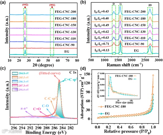 通过对EG@C14H10前体的XRD表征结果显示,其中同时存在EG和多环蒽烯相,在较低温度下未完全分解。XRD结果显示,随着闪光电压从90V到180V增加,FEG-CNCs样品002峰强度增强,表明石墨层结构改善。拉曼光谱结果进一步证实,FEG-CNC-180样品ID/IG比最小,I2D/IG比最大,结构最单晶。XPS结果表明FEG-CNC-180样品碳含量高于EG。氮吸附分析结果显示,FEG-CNC-180表面积34.45m2/g,大于EG的23.67m2/g,有利于钾离子的吸附和储存。总体来说,随着闪光电压的增加,FEG-CNCs样品的石墨层结构和表面活性中心数量得到提升,这为其提供了优异的电化学性能奠定了基础。值得注意的是,EG在经历高温闪光处理后,其结构基本保持不变。这表明该一步法简单高效,且对原材料结构影响小。FEG-CNC-180样品在600°C以下具有很好的热稳定性,为其作为钾离子电池负极材料提供了重要保障。