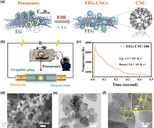 研究采用导电扩展石墨(EG)作为底物,通过闪蒸焦耳加热法(FJH)一步合成了碳纳米笼(CNCs)。首先,多环蒽烯(C14H10)分子被预处理后固定在EG表面。随后,采用FJH法将EG@C14H10前体快速加热到超过3000K,加热速率达1.5×105K/s,冷却速率5.6×103K/s。在这种极端条件下,C14H10分子快速热分解形成CNCs,产物称为FEG-CNCs。SEM和TEM结果显示,在180V下合成的FEG-CNC-180样品呈均匀球形,壁厚10-20nm,由多层石墨层组成。其中可见到0.346nm的晶格间距,表明具有石墨结构。值得注意的是,EG底物在FJH处理后基本保持原有层状结构,未发生显著破坏。这表明该一步法对原材料影响小,合成CNCs的同时也保留了EG的优良电导性。总之,该方法简单高效地一步合成了CNCs,为其作为钾离子电池负极材料提供了有利条件。