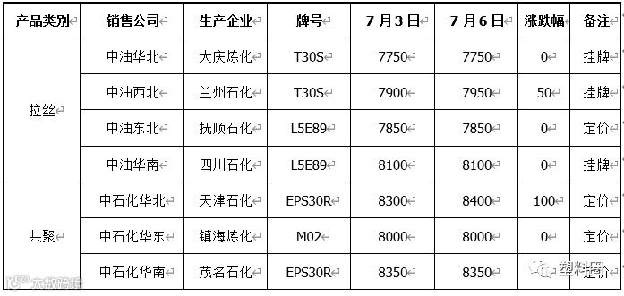 表2 石化出厂价格调整一览表(单位:元/吨)