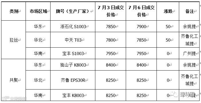 表1 我的塑料网(www.myplas.com)PP市场成交价格(单位:元/吨)