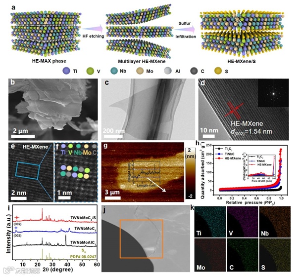 展示了HE-MXene的合成过程和结构表征,从扫描电子显微镜到原子力显微镜的详细图像分析。
