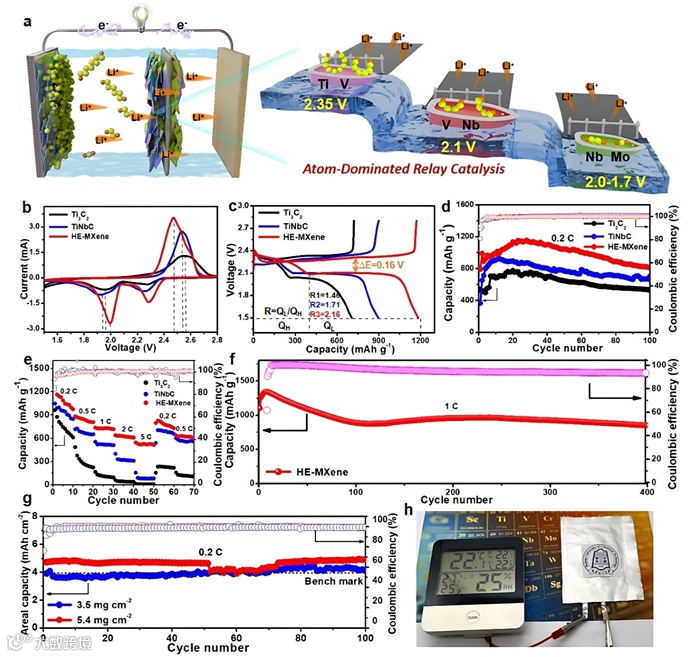 详细展示了HE-MXene在吸附、催化、无枝晶锂阳极等方面的独特效应,以及相关电化学性能的提升。