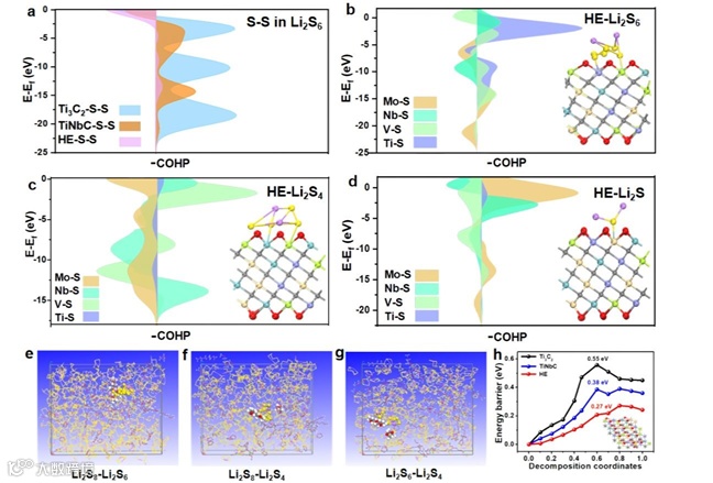 解析了HE-MXene在Li-S电池中的催化行为,包括多硫化物的吸附和分解的能垒计算。