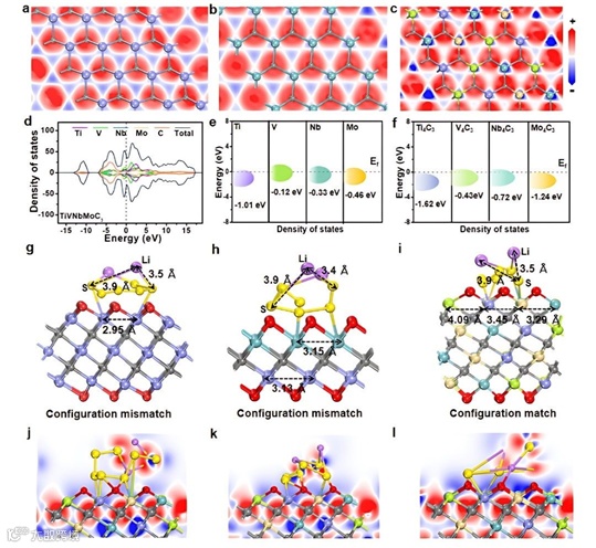 展示了MXene的电子结构和构型的密度泛函理论(DFT)计算,以及HE-MXene与Li2S6之间的构型兼容性分析。