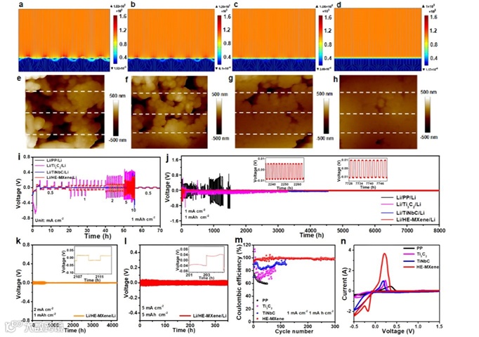 高熵MXene材料的弹性晶格配置促进了锂阳极上均匀的锂成核和沉积,防止了锂枝晶的无控生长。实验中,该材料在循环100次后仍表现出高达4.92 mAh cm-2的高面积容量,展示了极其优异的循环稳定性和长寿命。