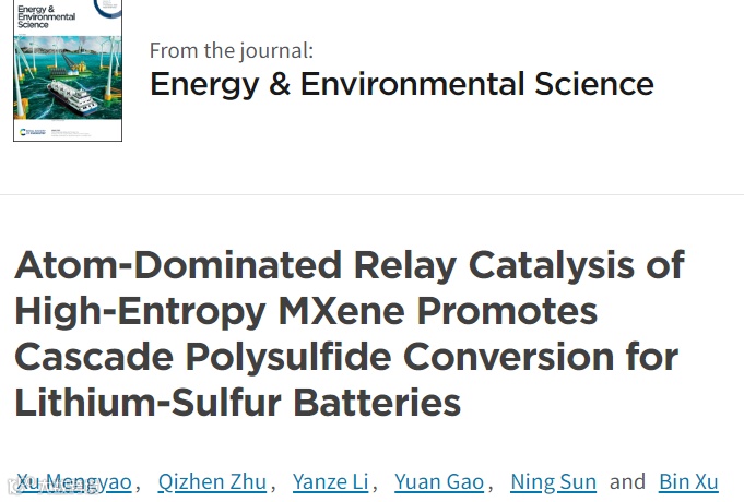 Mengyao Xu, Qizhen Zhu, Yanze Li,Yuan Gao, Ning Sun, Bin Xu, "Atom-Dominated Relay Catalysis of High-Entropy MXene Promotes Cascade Polysulfide Conversion for Lithium-Sulfur Batteries," Energy Environ. Sci., 2024, DOI: 10.1039/D4EE03402C.