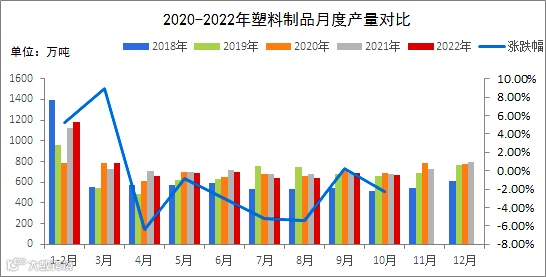 自2022年4月份开始,国内塑料制品月度产量缓速下行,同比去年降幅在10个百分点以内