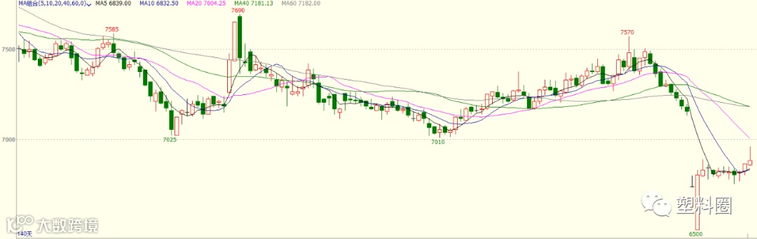 盘面情况:今日连塑2005合约开盘报6860元/吨,最高6960元/吨,最低6855元/吨,收于6885元/吨,涨50元/吨,涨幅在0.73%,成交量在218339手,持仓量减少4885手,报311047手。技术上,LLDPE2005合约高开后震荡小涨,尾盘收涨在6885元/吨。截止到收盘,资金流出1339万元,MACD指标中能量柱绿柱继续缩短,DEA线与DIFF线在中轴线下方继续回升,有即将形成金叉的趋势,KDJ指标在徘徊区小幅整理。从均线上来看,下方测试6800附近支撑,上方关注7000附近压力,短期期价或维持在6800-7000区间震荡,建议区间交易。