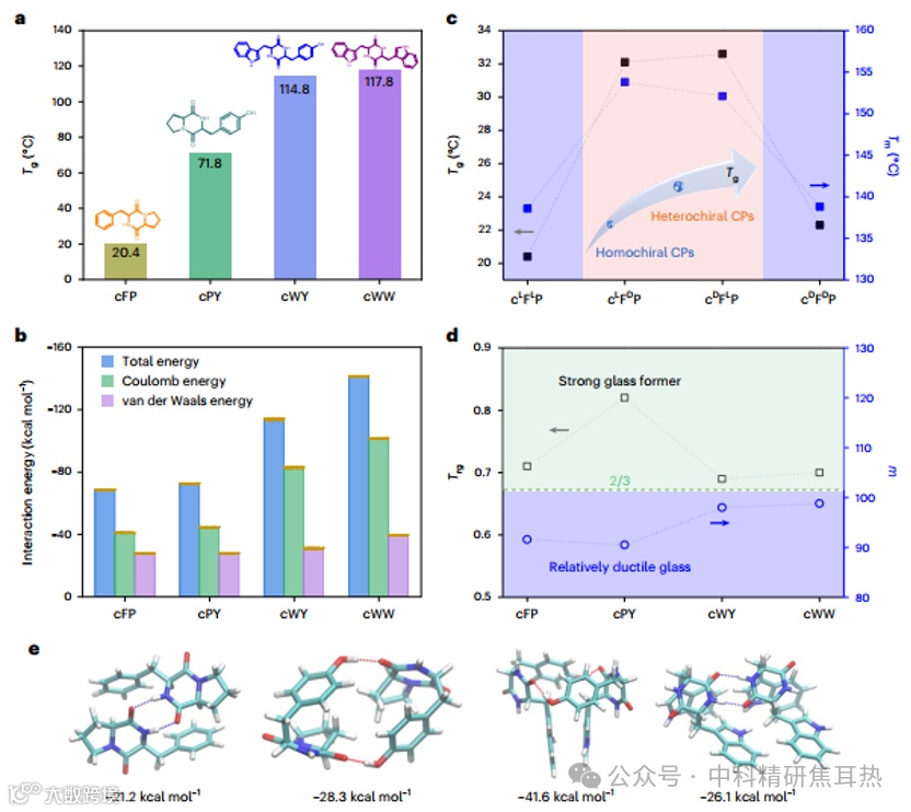 要点1:Tg与CP玻璃中CPs相互作用能量之间的关系被研究,较大的相互作用能量值与较高的Tg相关(图3b)。通过调节CP残基的类型和手性可以定制玻璃的Tg值(图3c)。