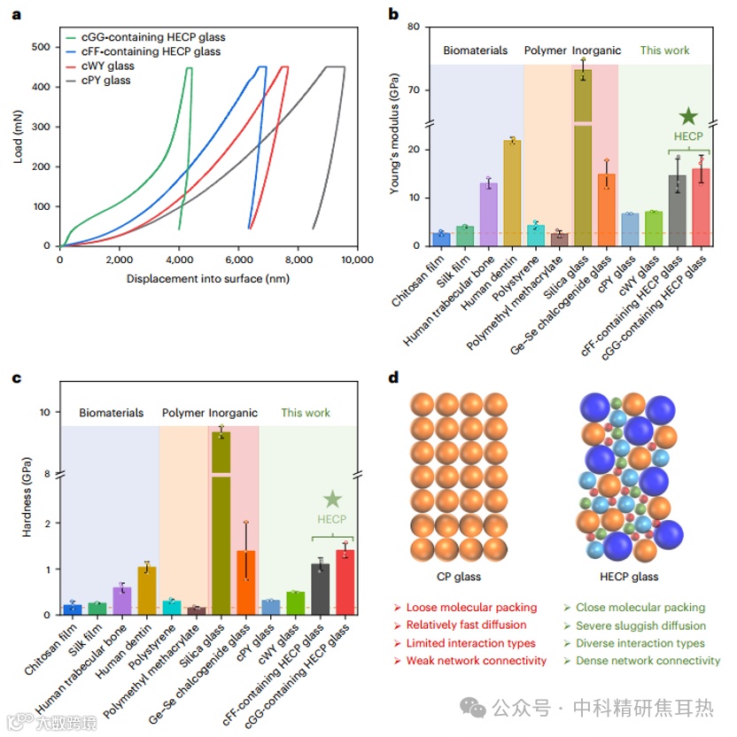 要点1:HECP玻璃显示出较单一CP玻璃更强的抗变形能力,其杨氏模量和硬度超越了许多生物材料和商业聚合物(图5a-c)。HECP玻璃的密集结构和高度连接的网络显著提升了机械性能(图5d)。