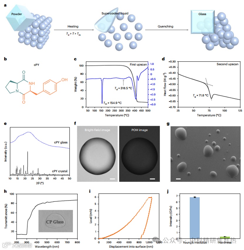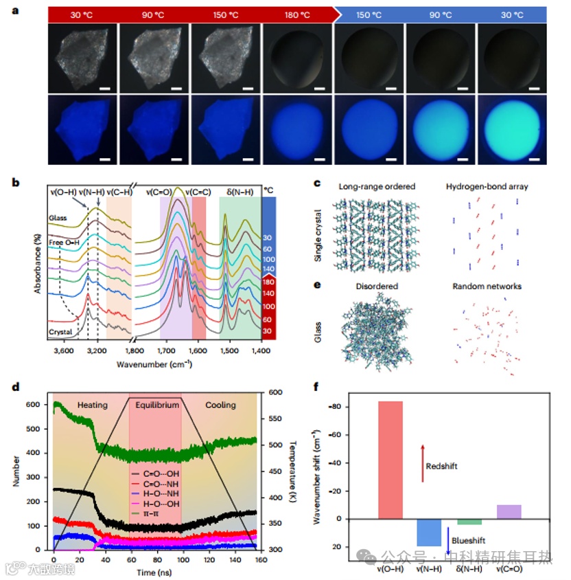要点1:cPY玻璃形成机制通过温度升高引起的形态变化(从晶体到球形结构)以及荧光颜色的变化得到阐明(图2a)。
