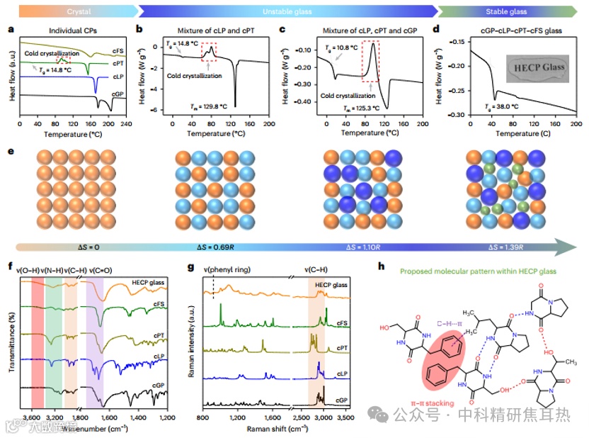 要点1:I型CPs可通过熔融-淬火形成稳定玻璃,而III型CPs难以形成稳定玻璃。混合不同类型的CPs可以增加系统熵,最终实现稳定的多组分CP玻璃(图4a-e)。