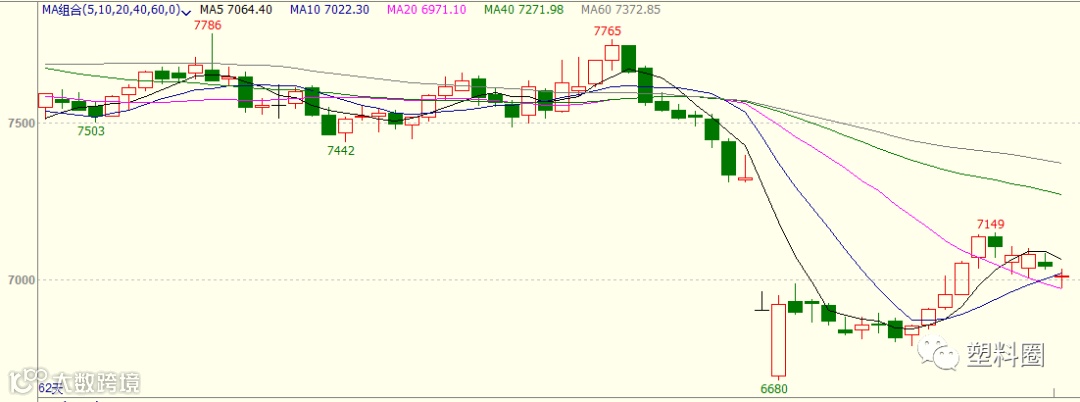 盘面情况:PP2005合约开盘7011元/吨,最低6976元/吨,最高7035元/吨,收于7013元/吨,跌43元/吨,跌幅0.61%。成交量增加至292100手,持仓量增加2794手至391623手。技术面来看,PP2005低开震荡收跌,增仓收小阴线,盘面资金流入357万元。MACD(12,26,9)指标中红色能量柱变短,DIFF与DEA处于0轴下方,开口变化不大。KDJ指标在徘徊区相交后开口变大。压力位7200附近,支撑位6800附近。