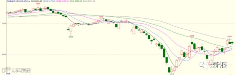 盘面情况:今日连塑2009合约开盘报6400元/吨,最高6440元/吨,最低6300元/吨,收于6360元/吨,跌90元/吨,跌幅在1.40%,成交量报471173手,持仓量减少5623手,报379205手。技术上,LL2009合约收小阴线,MACD指标红柱指标变化不大,DIFF线与DEA线继续向上发散,区中DIFF线突破0轴线,KDJ指标继续小幅回落。预计连塑近期维持在窄幅整理为主,下方测试6450支撑,上方测试6450附近压力,近期期价或维持在6250-6450区间震荡,建议区间交易。