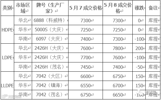 表1 我的塑料网(www.myplas.com)PE市场成交价格(单位:元/吨)