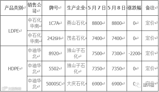 表2 石化出厂价格调整一览表(单位:元/吨)