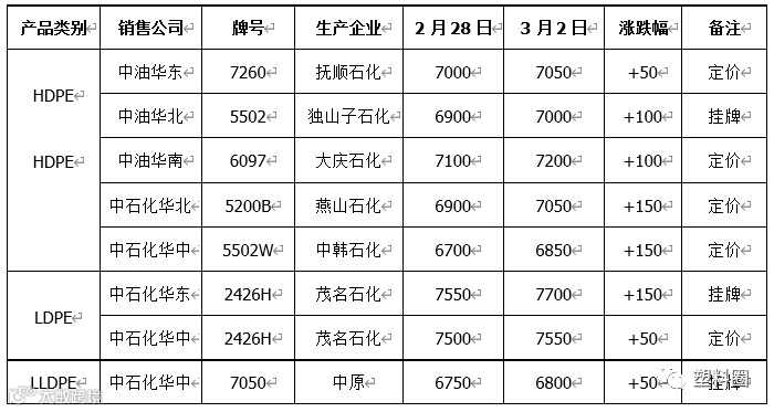 表2 石化出厂价格调整一览表(单位:元/吨)