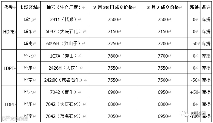 表1 我的塑料网(www.myplas.com)PE市场成交价格(单位:元/吨)