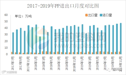 据海关数据统计, 2019年11月聚丙烯进口47.41万吨,环比增加2.55%,同比增长7.02%。今年累计进口467.09万吨。2019年11月聚丙烯出口3.66万吨,环比增加8.92%,同比增长22%。今年累计出口36.66万吨。