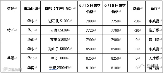 表1 我的塑料网(www.myplas.com)PP市场成交价格(单位:元/吨)