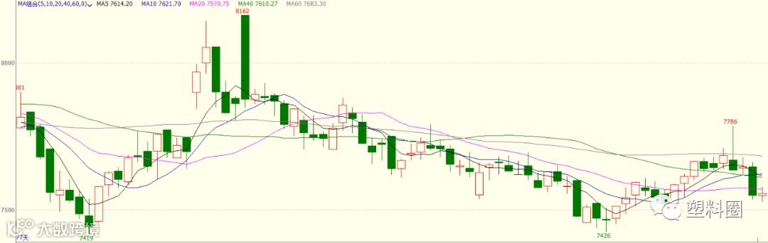 盘面情况:PP2005合约开盘7549元/吨,最低7528元/吨,最高7577元/吨,收于7556元/吨,跌40元/吨,跌幅0.53%。成交量减少至513514手,持仓量增加31466手至584268手。技术面来看,PP2005低开震荡,增仓收小阳线,盘面资金流入约6041万元。MACD(12,26,9)指标中红色能量柱变短,DIFF与DEA处于0轴下方,开口收敛。KDJ指标处于徘徊区,继续向下发散。压力位7800附近,支撑位7500附近。