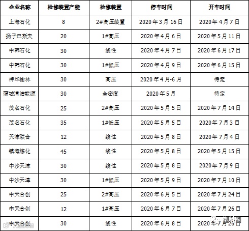 必看!一文搞清2020年上半年国内聚烯烃装置检修计划
