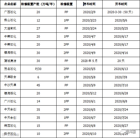 聚丙烯(PP)2020年上半年检修计划