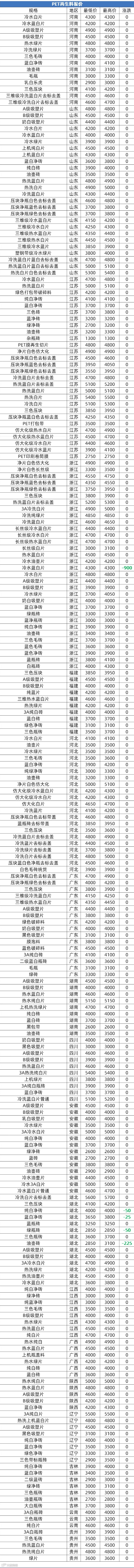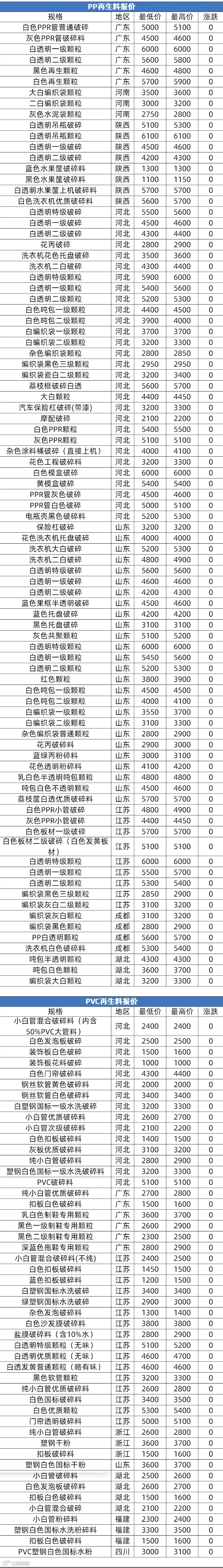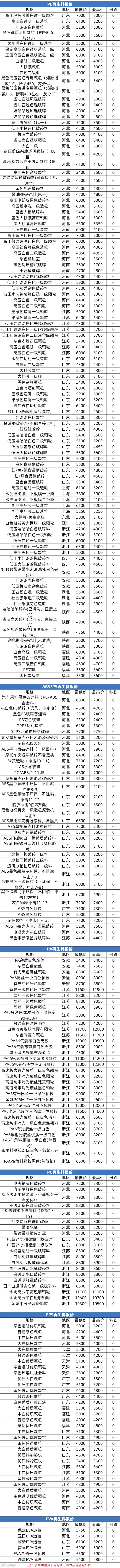 智采小工单再生 PVC 多地软硬质料市场稳,成交以刚需商谈为主;再生 PP/PE 弱稳,价格低位整理,下游随用随采,企业生产积极性低、观望浓;再生 ABS 多地报稳,下游备货积极性不高,实单议价;再生 PET 稳,需求弱、供需博弈,短线偏软;再生 EPS 稳,局部或因成本小涨,环保有支撑,整体波动有限。