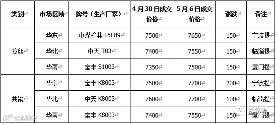表1 我的塑料网(www.myplas.com)PP市场成交价格(单位:元/吨)