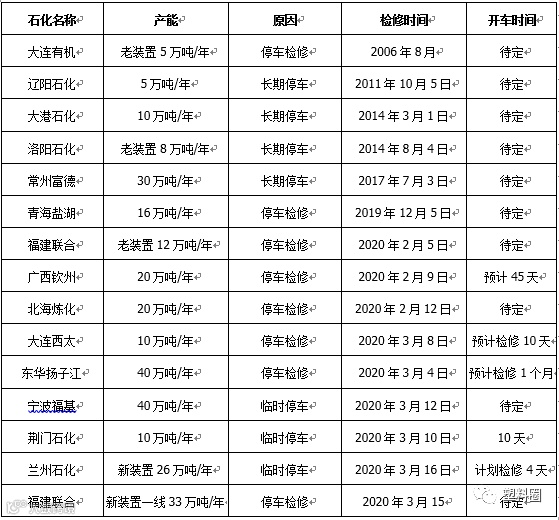 表3 PP石化停车检修统计