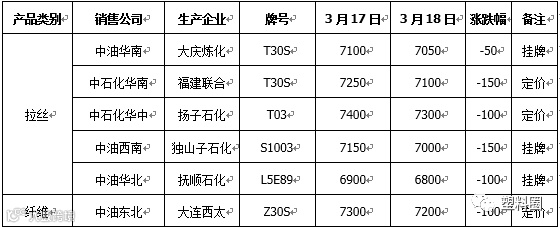 今日国内PP市场行情窄幅下行,拉丝价格多数稳定,个别牌号下跌50元/吨左右,部分共聚价格下调100元/吨左右。价格方面,国内拉丝主流价格在6650-7050元/吨不等,低熔共聚主流价格在7500-8100元/吨不等。石化出厂价格多数下调50-150元/吨不等,场内货源成本支持减弱。加之期货盘面高开震荡下行,减仓收中阴线,打压业者入市积极性。贸易商报盘部分低报,低价货源部分成交尚可,下游工厂按需采购为主,业者对后市观望氛围浓厚。