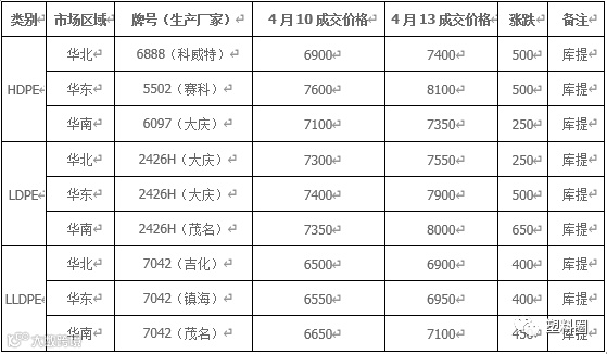 表1 我的塑料网(www.myplas.com)PE市场成交价格(单位:元/吨)