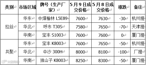 表1 我的塑料网(www.myplas.com)PP市场成交价格(单位:元/吨)