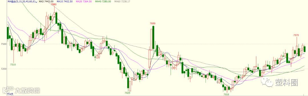 盘面情况:今日连塑2005合约开盘报7475元/吨,最高7490元/吨,最低7415元/吨,收于7420元/吨,跌40元/吨,跌幅在0.54%,成交量在176440手,持仓量减少5572手,报331991手。技术上,LLDPE2005合约高开震荡下行。截止到收盘,资金流出3164万元,MACD指标中能量柱红柱有所减少,DIFF线与DEA线小幅震荡回落,KDJ指标在徘徊区小幅震荡。从均线上来看,下方测试7400附近支撑,上方关注7500附近压力,短期期价或维持在7400-7500区间震荡,建议区间交易。