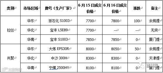 表1 我的塑料网(www.myplas.com)PP市场成交价格(单位:元/吨)