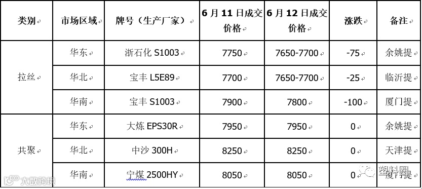 表1 我的塑料网(www.myplas.com)PP市场成交价格(单位:元/吨)