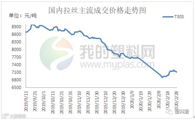 本月国内PP市场价格震荡走软,截止2月28日,国内拉丝主流成交价格在6750-7600元/吨左右,整体价格较上月下跌300-500元/吨左右;低融共聚主流价格在7700-8500元/吨左右,价格较上月下跌300-450元/吨左右。月初期货盘面弱势,一定程度打压业者信心。加之石化出厂价格部分下调,石化库存高位,场内销售压力增大。受新冠疫情影响,下游工厂以及物流开工缓慢,贸易商出货不畅,部分让利促进成交为主,市场交投尚未恢复。本月中下旬,期货盘面转红,一定程度提振业者信心。终端工厂开工缓慢,部分复工企业多有拿货,但短期采购后,追涨积极性减弱。临近月底,石化出厂价格部分上调,货源成本支撑增强。但期货盘面转绿,月线跌破7000大关,打压业者入市积极性。贸易商随行出货为主,下游工厂复工缓慢,对高价货源抵触情绪明显,市场观望气氛浓厚。