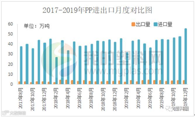 据海关数据统计, 2019年12月PP进口总量55.29万吨,环比增长16.62%,同比增长31.64%。今年累计进口522.38万吨。2019年12月PP出口总量3.81万吨,环比增长4.09%,同比增长27.00%。今年累计出口40.47万吨。