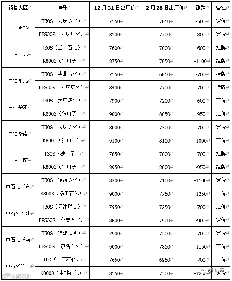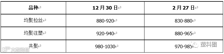 根据我的塑料网真实成交数据显示,本月国内PP市场价格跌后反弹。截止2月28日,国内拉丝主流成交价格在6750-7600元/吨左右,整体价格较上月下跌300-500元/吨左右;低融共聚主流价格在7700-8500元/吨左右;价格较上月下跌300-450元/吨左右。