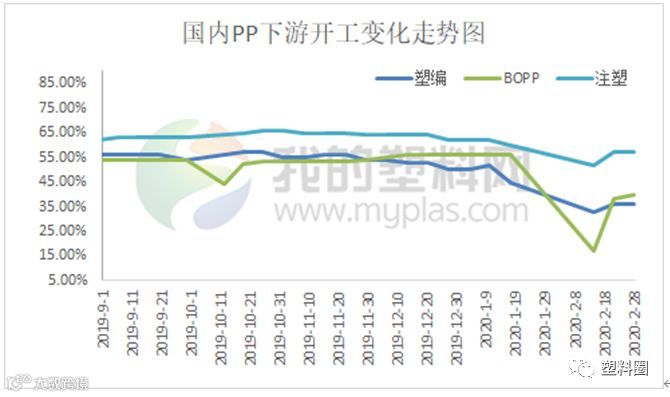 本月聚丙烯下游企业开工率变化不大。其中塑编行业开工率在36%左右;注塑行业开工率在57%;BOPP行业开工率在40%左右。原料连跌行情加重下游看空心态,下游工厂陆续复工,接货积极性一般,多小单补入,成品库存维持中偏低位。