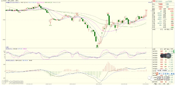 PP2009合约开盘7193元/吨,最低 7181元/吨,最高7457元/吨,收于7456元/吨,涨226元/吨,涨幅3.13%。成交量减少至869912手,持仓量增加69103手至516506手,资金流入6.92亿。
