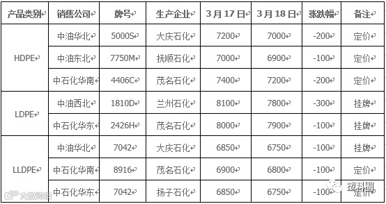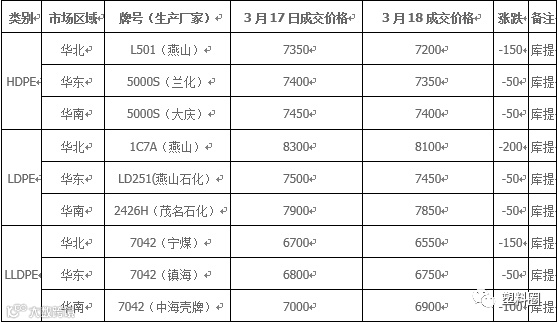 表1 我的塑料网(www.myplas.com)PE市场成交价格(单位:元/吨)
