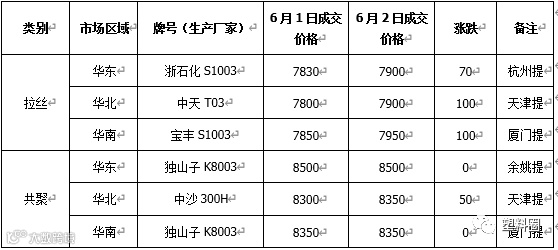 表1 我的塑料网(www.myplas.com)PP市场成交价格(单位:元/吨)