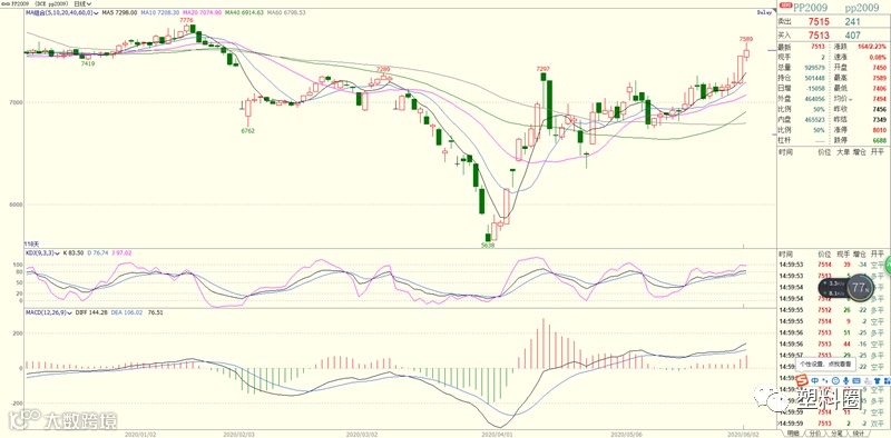 盘面情况:PP2009合约开盘7450元/吨,最低 7406元/吨,最高7589元/吨,收于7513元/吨,涨164元/吨,涨幅2.23%。成交量增加至929579手,持仓量减少15058手至501448手,资金流出9206万。PP2009期货低开周五夜盘高开后持续走高,今日开盘后拉升至7589后减仓回落,日内增量减仓收上下影小阳线。技术面来看,MACD(8,13,9)指标来看红柱继续伸长,两线在0轴上方发散向上,KDJ指标继续向上,短期上行动力增加。均线系统来看呈现明显多头排列。短期支撑位7300,压力位7800。