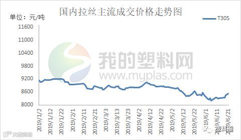 本周国内PP报价呈上涨态势。截止6月21日,国内拉丝主流成交价格在8450-8650元/吨不等,较上一周价格上涨100-200元/吨左右;低熔共聚主流价格在8850-9200元/吨不等,整体价格较上一周上涨50-100元/吨左右。