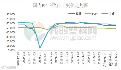 截止6月21日当周,本周聚丙烯下游企业开工情况较上周变化不大。其中塑编行业开工率在61%左右;注塑行业开工率在62%;BOPP行业开工率在54.2%左右。市场行情上行后走货承压明显,塑编企业多消化前期备货为主,继续补仓量很小。工厂订单量有所下滑,采购积极性不高,多数按需采购为主。