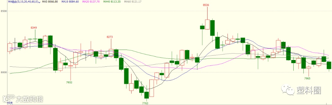 PP2001合约开盘8085元/吨,最低8007元/吨,最高8100元/吨,收于8028元/吨, 跌102元/吨,跌幅1.25%。