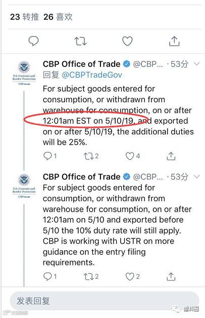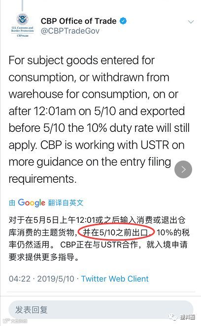 但是,也有点微弱的好消息:根据CBP的说法,只要在5月10日前从中国出口了,即使货物还未抵港,仍可按照10%税率征收!对于这一点,建议各位小伙伴尽快与美方收货人尽快核实操作细节!